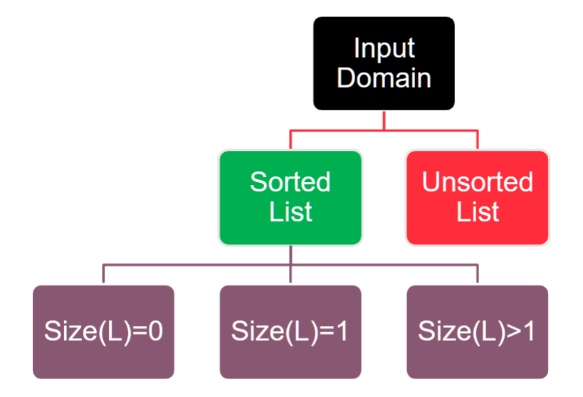 ). 将指南应用于分支以创建子分区(例如,将“零一多”指南应用于“排序列表”分支会创建“Size(L)=0”、“Size(L)=1”和“Size(L)>1”的节点)。 - Continuing this process, applying more guidelines to further partition the inputs (e.g., applying the "Ranges" guideline for the