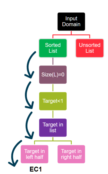 is infeasible because an empty list cannot contain the target. You must analyze each path and prune the ones that are logically impossible. '(Sorted List) & (Size(L)=0) & (target in list)' 是 不可行的,因为空列表不能包含目标。您必须分析每条路径并修剪逻辑上不可能的路径。
