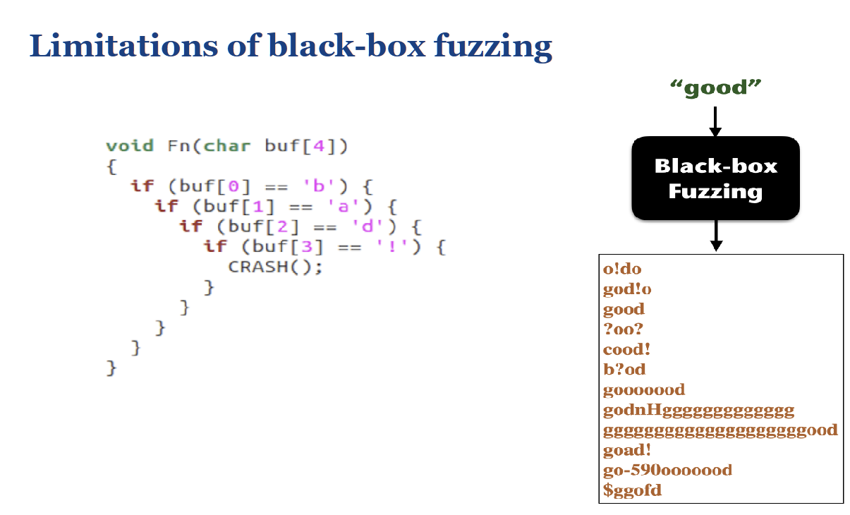 - A black-box fuzzer generates random inputs like "good", "cood!", "goad!", etc.. Since the fuzzer has no knowledge of the program's internal logic, the probability of it guessing the precise four-character sequence "bad!" is extremely low. It's effectively trying to guess a password blindfolded. 黑盒模糊器生成随机输入,如“good”、“cood!”、“goad!”等。由于模糊器不了解程序的内部逻辑,因此它猜测精确的四个字符序列“坏”的概率极低。它实际上是在试图蒙住眼睛猜测密码。