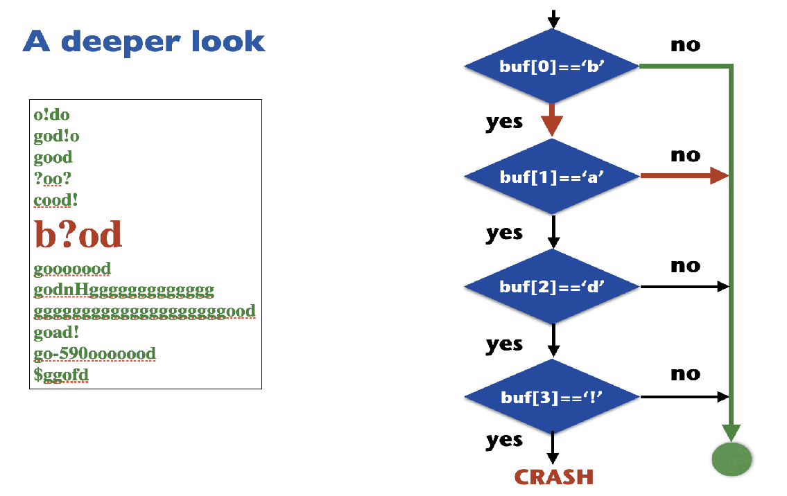 buf[0]=='b',buf[1]=='a', etc.) to trigger the crash.If any single check fails (the "no" path), the program exits without crashing. This clearly shows the specific, narrow path an input must follow, reinforcing why random guessing is so inefficient. 如果任何单个检查失败(“no”路径),程序将退出而不会崩溃。这清楚地显示了输入必须遵循的特定、狭窄的路径,强化了随机猜测效率低下的原因。