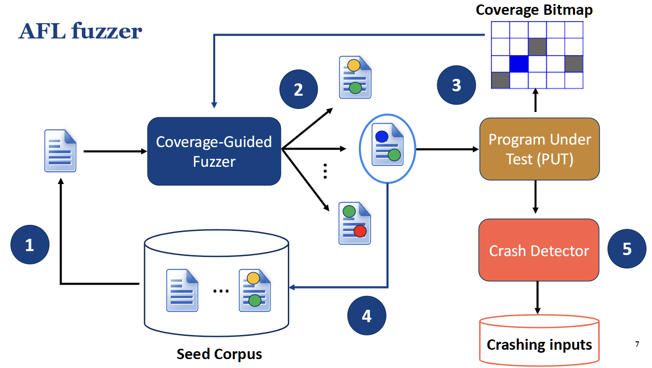 - Execution & Coverage: The mutated input is fed to the Program Under Test (PUT). The program has been "instrumented" (modified) to report which code paths it executes. This information is stored in Coverage Bitmap.