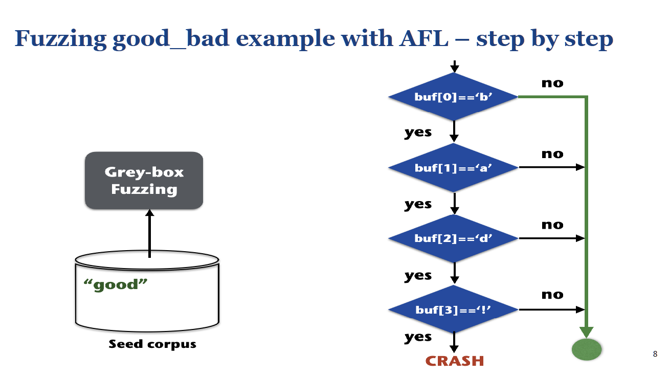 buf[0]=='b')—a new path! - Save & Prioritize: The fuzzer adds "bood" to the seed corpus because it's interesting.